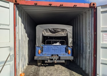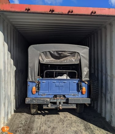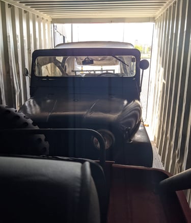 Exportação de dois Willys Jeep 1971 em container 40’ para Vigo, Espanha. Um dos veículos foi enviado como donor car, destinado a fornecer peças para o Jeep principal que seria restaurado. Gestão completa de documentação, stuffing e acompanhamento da operação até a entrega na porta do cliente final.